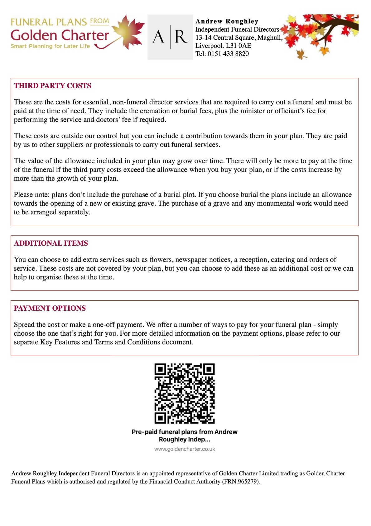 Andrew Roughley Independent Funeral Directors is an appointed representative of Golden Charter Limited trading as Golden Charter Funeral Plans which is authorised and regulated by the Financial Conduct Authority (FRN:965279).